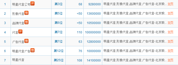 優(yōu)化要求:在百度,google等搜索引擎查找明星代言等相關關鍵字,能第一時間在全國各大網(wǎng)站拓印而出