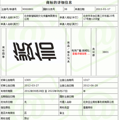 其中,最關鍵的第38類電信及通信服務被北京聯(lián)智昭陽文化傳播有限責任公司(以下簡稱“聯(lián)智”)搶注,申請日期為2011年1月17日,而騰訊公司對第38類商標的申請日期為2011年1月24日,較上述公司晚一個星期。
